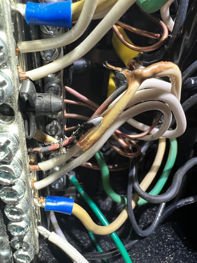 After Shaune unscrewed the panel, we could see the issue. The dryer connection was arching and touching another wire. The smell was the protective wrap around the wire burning away.