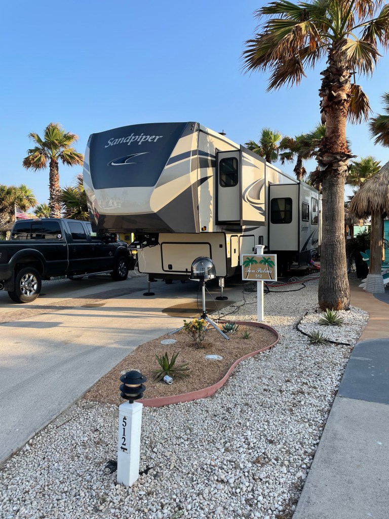 Let’s set one thing straight. Gulf Waters RV Resort was beautiful and was at no fault of the vomit or electrical fires! Camp Chaos made her third excursion of the season 4 hours south to the Texas Gulf Coast. Gulf Waters RV Resort is on the island close to Port Aransas. It is a good distance away from city amenities like restaurants, gift shops, and stores so make sure you have everything you need!